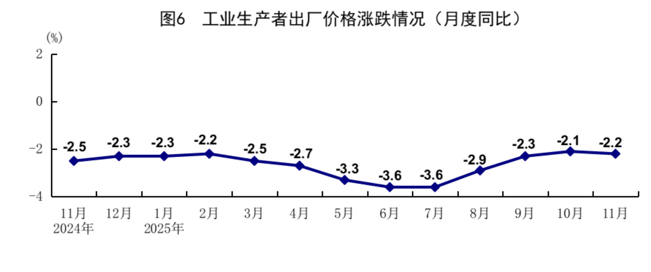 11月份,全国工业生产者出厂价格同比下降2.2%,环比上涨0.1%;全国工业生产者进价同比下降2.5%,环比上涨0.1%。1-11月份,全国工业生产者出厂价格和购进价格同比分别下降2.7%、3.1%。